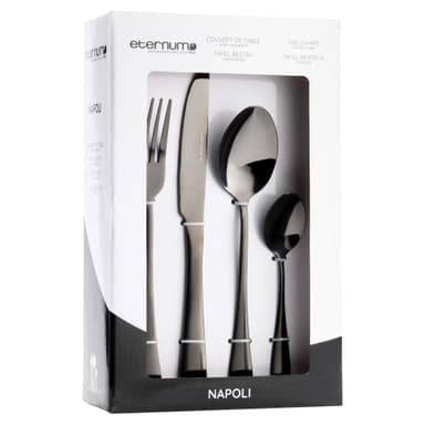 Mukavat arkiset aterimet klassikolta Eternumilta. 16-osainen setti mustaa väriä. Setissä on neljä haarukkaa, veistä, lusikkaa ja teelusikkaa.