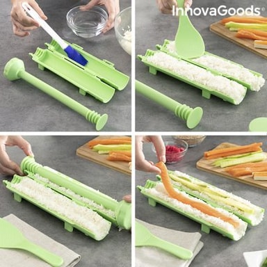 Ett komplett och mycket praktiskt sushiset för att förbereda sushi lättare och snabbare. Det innehåller flera tillbehör med specifik design för detta ändamål (form, sked och matta) som gör att du kan uppnå ett professionellt resultat. Först och främst måste det kokta riset placeras i formen med skeden och hålet måste göras i mitten med kolven. Sedan placeras de önskade ingredienserna och pressas. Därefter läggs den kompakta risrullen på tångbladet, rullas, pressas med mattan, skärs i tjocka skivor och till sist kan utsökt sushi serveras och avnjutas.