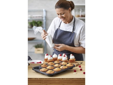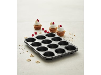 Muffinform med 12 rum/hål, tillverkad i stål med non-stick-beläggning som släpper lätt och är enkel att rengöra. Varje hål, dia. 7,1 cm, rymmer 0,08 liter, och formen används för bakning av alla typer av muffins, portionskakor och bullarLäs mer om produkten