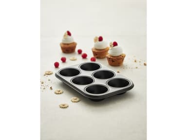 Muffinform med 6 rum/hål, tillverkad i stål med non-stick-beläggning som släpper lätt och är enkel att rengöra. Varje hål, dia. 7,1 cm, rymmer 0,08 liter, och formen används för bakning av alla typer av muffins, portionskakor och bullarLäs mer om produkten