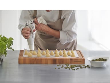 Spritspåse 46 cm vit bomull. Blomsterbergs tygspritspåse. Spritspåse i 100 % bomull, 46 cm. Innan användning ska det lilla hålet i spritspåsen anpassas till tyllarna. Klipp av 2-3 mm i taget på påsen, så att tyllens smala ende sticker ut 1 cm.Läs mer om produkten