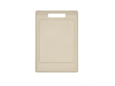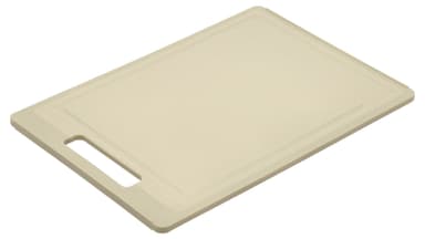 Funktionell skärbräda i beige plast. Brädan har ett brett saftspår på ena sidan och är slät på den andra, så att båda sidorna kan användas för olika skäruppgifter. Skärbrädan står stadigt på bordet eftersom den har en halkfri kant på båda sidorLäs mer om produkten