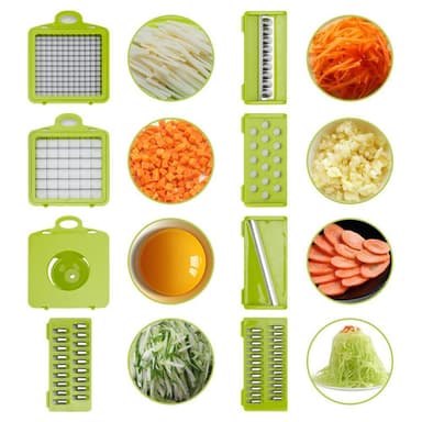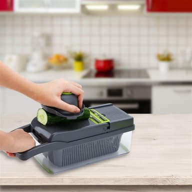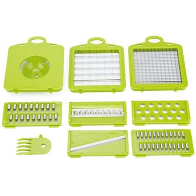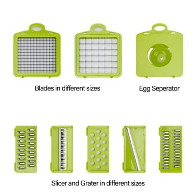 Justerbar multiskivare med olika tillbehör för skivning, skalning, rivning, rakning av grönsaker, frukt, ost, ägg, kött etc.