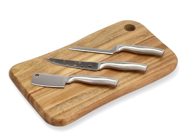 Duka upp ett fulländat och läckert ostbord med den vackra, organiskt formade serveringsbrädan i akaciaträ och 3 olika ostknivar i rostfritt stål för servering av både hårda, mjuka och krämiga ostarLäs mer om produkten