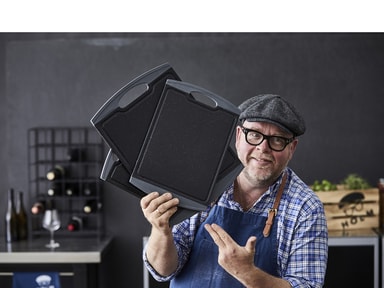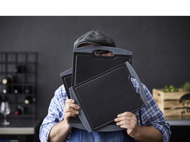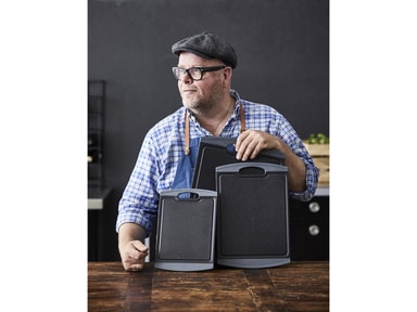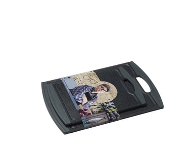 Skärbräda 2 st plast HOLM. 2 st skärbrädor med kant i grått gummi. Stl: 29,2 x 20,3 x 1 cm och 36,8 x 25,4 x 1 cm De halksäkra kanterna gör att brädan ligger stabilt på bordet. Skärbrädan är försedd med saftränder. Lätt att rengöraLäs mer om produkten