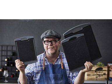 Skärbräda plast 44x30cm HOLM. Skärbräda med kant av grått gummi. Stl: 44,5 x 30,5 x 1 cm. Den halksäkra enden gör att brädan ligger stabilt på bordet. Skärbrädan är försedd med saftränder. Lätt att rengöraLäs mer om produkten