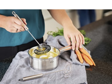 Med vispens spiralformade huvud kommer man enkelt åt allt i kastrullen. Man når även ner i hörn som normalt kan vara svårnådda. Materialen, 18/10 rostfritt stål och silikon, klarar även av höga temperaturer på upp till 260°C. Tål maskindisk. (R95545)Läs mer om produkten