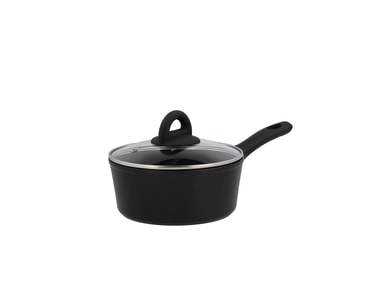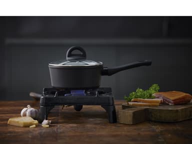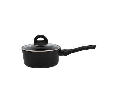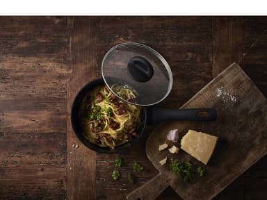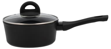 Kastrullen har en 3,0 mm tjock botten och lämpar sig för alla värmekällor – även induktion. Den är tillverkad i aluminium och har keramisk beläggning invändigt, och utvändigt har den en beläggning i silikon-polyester. Handtaget är i svart bakelitLäs mer om produkten