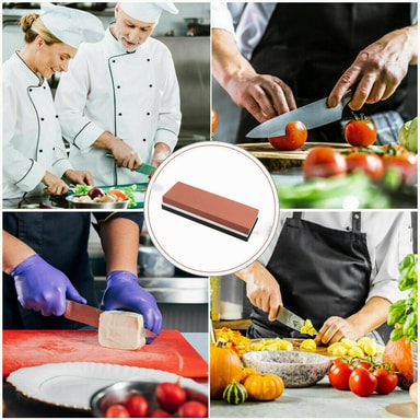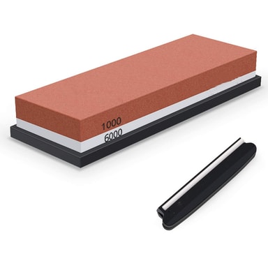 Komplett våtslipstenssats med brynsten, hållare och slipstöd. Slipstenen har två sidor med olika kornstorlek, en för att göra skåran och glitchen plattare, den andra för att göra kanterna vassare. Hållaren i silikon håller brynet fixerat under knivslipningen.