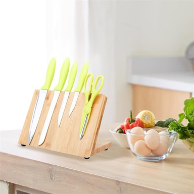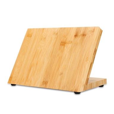 Träknivblock med magnet tillverkat av bambu för platsbesparande förvaring av knivar och köksredskap.