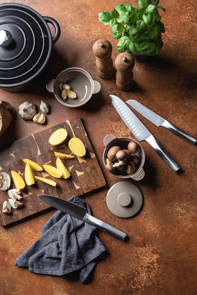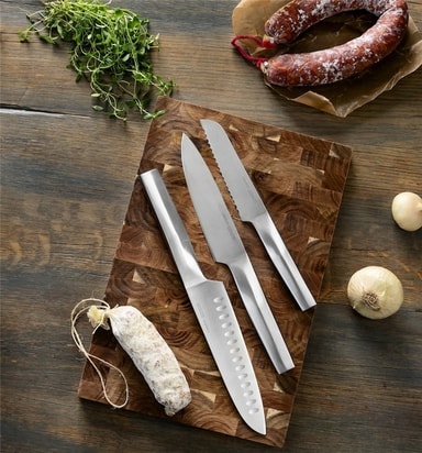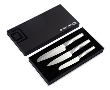 Det kompletta knivsetet från Orrefors Jernverk. Här har vi samlat alla knivar som är ett ""måste"" i köket. Du får en kockkniv, en japansk kockkniv och en tomatkniv av högsta kvalitet. De kommer i en snygg presentkartong och är en utmärkt gåva. Jon Eliason står bakom den morderna designen.