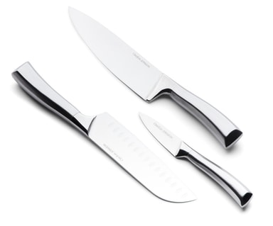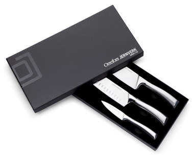 Ett mycket användbart och exklusivt knivset om tre knivar, japansk kockkniv, kockkniv och en skalkniv. Knivarna har mycket bra skärpa och fungerar givetvis utmärkt att använda även till grönsaker, kött, fisk och annat.