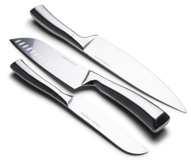 Ett mycket användbart och exklusivt knivset om tre knivar, japansk kockkniv, kockkniv och en tomatkniv. Knivarna har mycket bra skärpa och fungerar givetvis utmärkt att använda även till grönsaker, kött, fisk och annat.