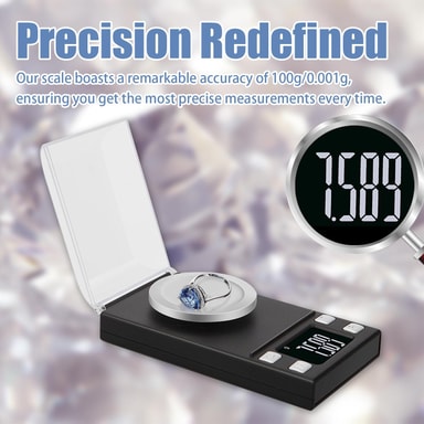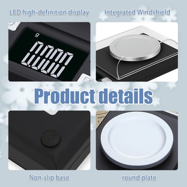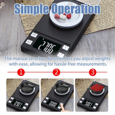 Noggrann precisionsvåg: Vågen har en hög noggrannhet på 0,001g, vilket säkerställer att du får de exakta mätningar även vid mycket små mängder. Maxvikten för vågen är 100 g.