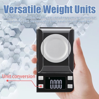 Olika viktenheter: Du kan växla mellan olika viktenheter som gram (g), ounces (oz), troy ounces (ozt), pennyweights (dwt), karat (ct) och korn (gn).