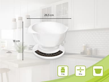 Inkluderar stor skål med handtag och hällpip (2,5L), Mekanisk Tare funktion. Lätt att rengöra. Dimensioner 26,5 x 26,5 x 18 cm.Läs mer om produkten