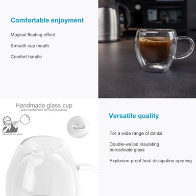 Det förhindrar att varma drycker svalnar snabbt utan att utsidan värms upp och bränner fingrarna. Tack vare den dubbla väggen lämnar glasen ingen vattenring efter sig när du dricker kalla drycker!