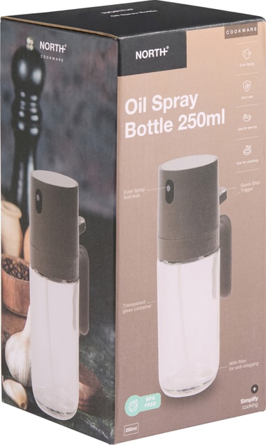 "250 ml North olje- och vinägerflaska 205201, perfekt för att spraya olja på pannor eller vinägrett på sallader. Läcksäkert munstycke med silikonringar, kyl- och diskmaskinssäker för lätt rengöring."Läs mer om produkten