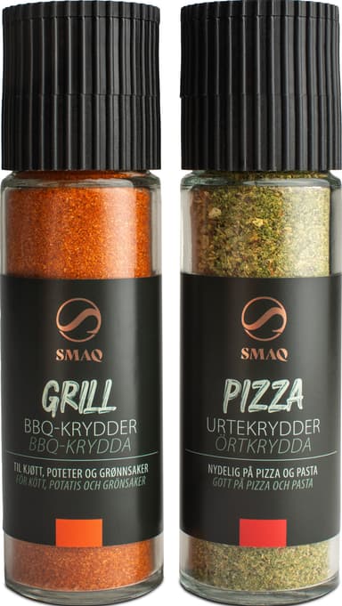 SMAQ kryddpresentförpackning 8003 innehåller två kryddflaskor: en med grillkrydda för kött, potatis och grönsaker, och en med pizzaörter för pasta, pizza och sallader. Den är perfekt för vardagsmatlagning eller som present.Läs mer om produkten