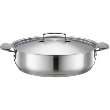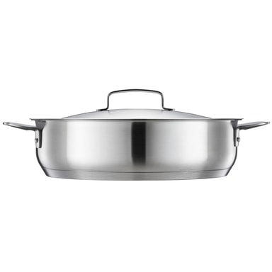 Den tjocka 3-lagersbotten ger effektiv och jämn uppvärmning på alla hällar. Den har också ett ugnssäkert handtag, lock med ångventilering samt en måttgradering på insidan.