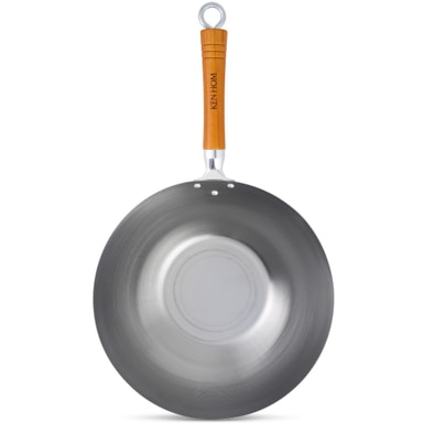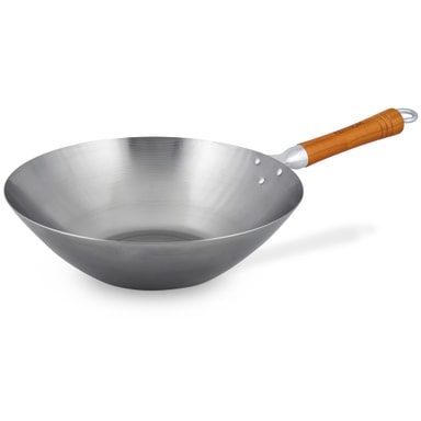 Denna wok är tillverkad av starkt kolstål, som är en legering av stål och järn som bildar en mycket stark och robust metall. Pannan har platt bas för att sitta på vilken typ av spis som helst, inklusive induktion utan hjälp.