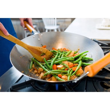 Denna wok är en del av Ken Homs Excellence-kollektion, och är tillverkad av starkt kolstål, som är en legering av stål och järn som bildar en mycket stark och robust metall. Pannan har platt bas för att sitta på vilken typ av spis som helst, inklusive induktion utan hjälp.