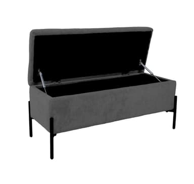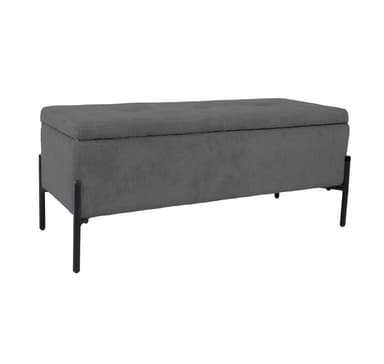 Bänk RORI med förvaringslåda 95x35xH41cm, grå. Bänkens sits och kropp är klädda och klädda med polyestertyg. Benen på bänken är gjorda av metall och avslutade med en svart pulverlackering. Djupet på förvaringslådan är 18 cm.