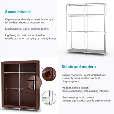 Detta moderna DIY plug-in hyllsystem består av ett stort fack (förvaringsutrymme, 2 klädstänger, sidofickor och helt användbart golv). Tack vare den moderna och tidlösa designen passar garderoben perfekt in i alla rum och inredningar, samtidigt som den tar liten plats. Dra nytta av denna genomtänkta och mångsidiga design, eftersom dina tillhörigheter alltid är snyggt stuvade och inom räckhåll!