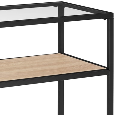 Piffa upp ditt hem med det kantiga Kilkenny-avlastningsbord från tectake. Konstruktionen, designad i typisk industriell chic, är särskilt imponerande med sin övre hylla av glas, genom vilken även hyllan i trälook nedanför är synlig. Den pulverlackerade stålramen i svalt svart ger det smala hallbordet god stabilitet och en tydligt avgränsad stomme. Trots valet av högkontrastmaterial öppnar den minimalistiska designen av den rektangulära möbeln för nästan obegränsade kombinationsmöjligheter – en inredningsidé med stark karaktär: det anmärkningsvärda Kilkenny-avlastningsbord från tectake.