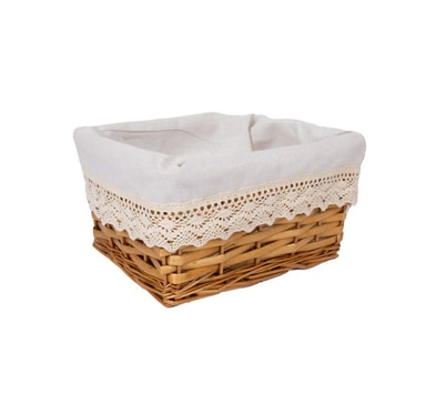 Korg MAX 24x18xH12cm, väv, färg: ljusbrun, med spetstyg. Korgmaterial: betsad delad pil, tyg: canvas med spets.