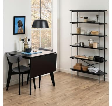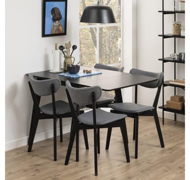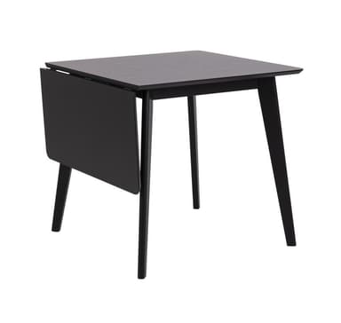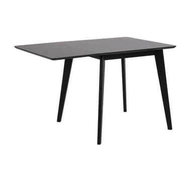 Matbord ROXBY, 80/120x80xH76cm, svart. Med Förvaring av iläggsskivor. Bordsskiva: fanerad ek, svartbetsad, lackerad, bas: gummiträ, svartmålad.