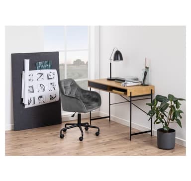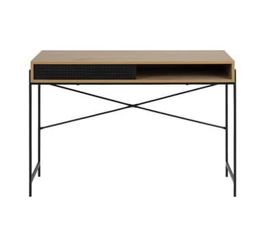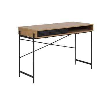 Skrivbord ANGUS 110x50xH75cm, ek. Ett skrivbord är ett nödvändigt tillägg till alla hem, vilket gör att du kan använda en dator mer bekvämt eller skapa ett praktiskt hemmakontor. Träfärgade skrivbord är idealiska för hemmiljö, eftersom det varma materialet och mjuka tonerna fungerar bra med olika möbler. Skrivbordet har en skjutdörr. Bordsskivan är gjord av melamin. Färgen är vild ek. Basen är gjord av pulverlackerad metall. Färgen är mattsvart. Måtten på produkten är 110x50xH75cm.