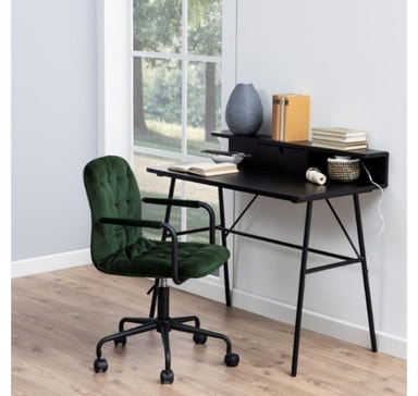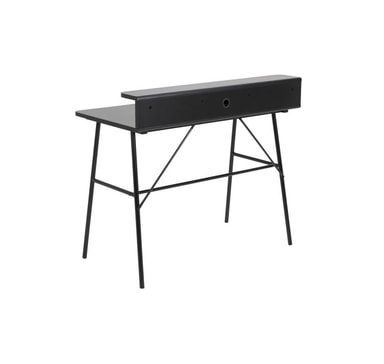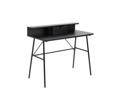 Skrivbord PASCAL 100x55xH88,8cm, svart. Ett skrivbord är ett nödvändigt tillägg till alla hem, vilket gör att du kan använda en dator mer bekvämt eller skapa ett praktiskt hemmakontor. Skrivbordet har en låda och en hylla. Bordsskivan är gjord av MDF. Färgen är mattsvart. Benen är gjorda av svart metall. Måtten på produkten är 100x55xH88,8cm.