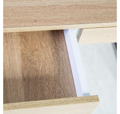 Skrivbord STUDY 90x60xH76cm, ek. Ett skrivbord är ett nödvändigt tillägg till alla hem, vilket gör att du kan använda en dator mer bekvämt eller skapa ett praktiskt hemmakontor. Träfärgade skrivbord är idealiska för hemmiljö, eftersom det varma materialet och mjuka tonerna fungerar bra med olika möbler. Skrivbordet har två lådor med metallskenor och ett förvaringsutrymme som kan öppnas uppifrån. Skrivbordet är tillverkat av melaminskiva. Färgen är vit, naturlig. Grå pulverlackerad metallram. Måtten på produkten är 90x60xH76cm.