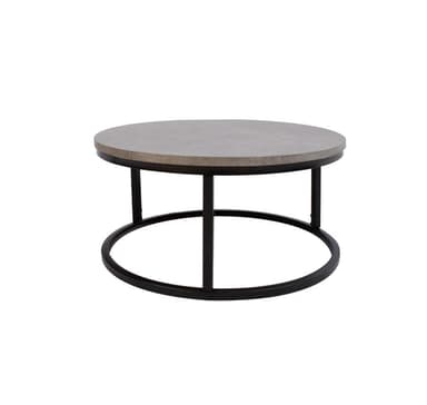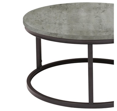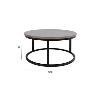 Soffbord BRITE D60xH32cm, grått. Bordsskivans inredning ser ut som betong. Den är gjord av 18 mm MDF-skiva. De svarta metallbenen och basramen är pulverlackerade. Mått på bordet D60xH32cm.