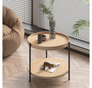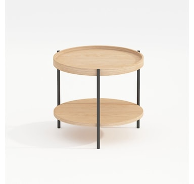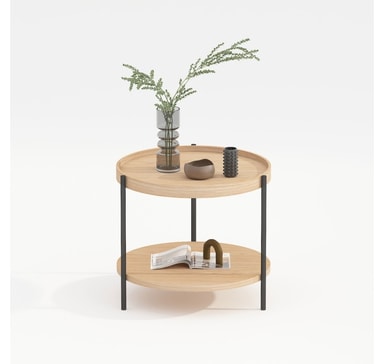 Soffbord CINDY D50xH45cm, melamin ek. Bordsskivan och nedre hyllan är gjorda av melaminskiva med ljus ekdekor. Bordets ben och stomme är gjorda av metall och avslutade med en svart pulverlackering.