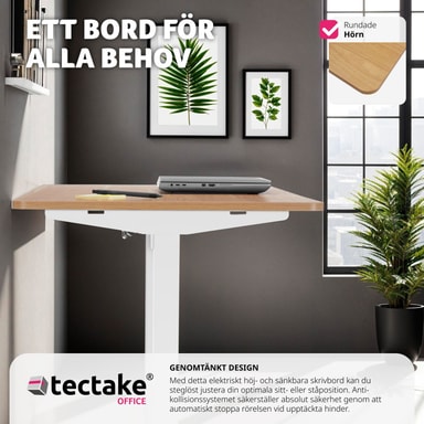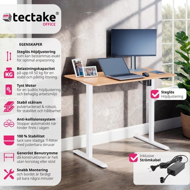 Det elektriskt höj- och sänkbara skrivbordet Skadi från tectake sätter nya standarder för ett hälsosamt arbetsflöde. Oavsett om det är på ditt kontor eller i hemmakontoret, möjliggör det dynamiskt och ergonomiskt arbete genom en sömlös växling mellan sittande och stående position.