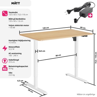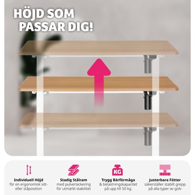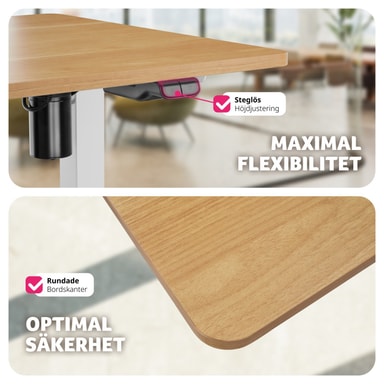 Tack vare den kraftfulla, mycket tysta motorn kan du anpassa skrivbordshöjden helt efter dina behov och därmed effektivt förebygga ryggbesvär. Anti-kollisionssystemet säkerställer absolut säkerhet genom att upptäcka hinder och automatiskt stoppa höjdjusteringen.