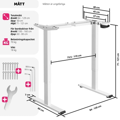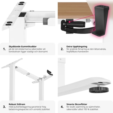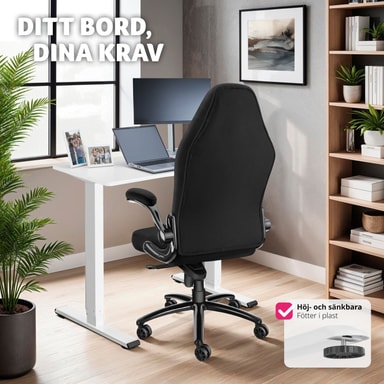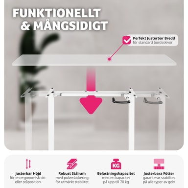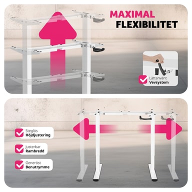 Med den lättanvända handveven kan du justera höjden steglöst till din idealiska sitt- eller ståposition, perfekt för att få in lite rörelse under en lång arbetsdag och avlasta din rygg. Tack vare den justerbara bredden kan det anpassas exakt och är därför perfekt för alla vanliga bordsskivor – så att du kan utforma din skrivbordsuppsättning precis som du vill.