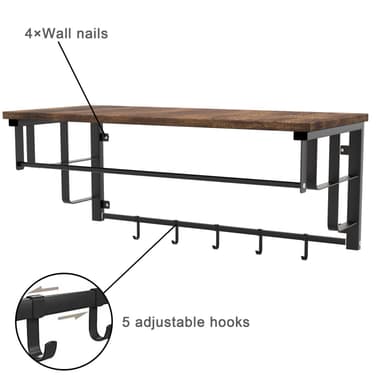Tack vare sin vintagedesign är väggklädhängaren ett riktigt blickfång och förhöjer din interiör visuellt. 3 i 1-funktionen bestående av hylla med måtten 66x30cm, stång och 5 avtagbara krokar gör klädhängaren så praktisk och mångsidig.