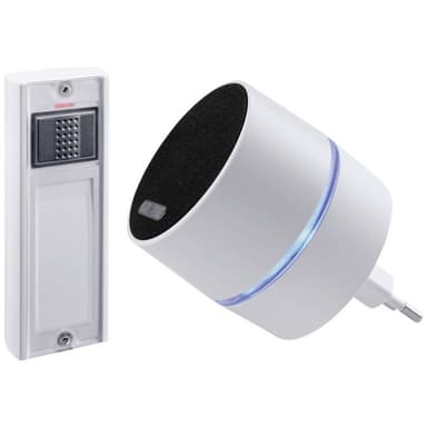 Grothe 43600 Trådlös gong Komplett set med namnskyltSpänningsförsörjning via ett vägguttag Trådlös anslutning mellan trådlös dörrklocka och trådlös ringklocka Meny med röstmeddelanden Led-ring för optisk signalering och nattljusfunktion KlangstarkLäs mer om produkten