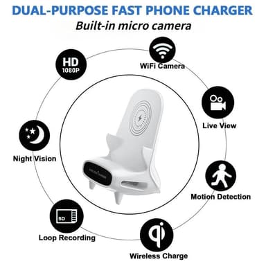 Trådlös Laddare Dold Kamera Fjärrövervakning 1080P HD WiFi Säkerhetskamera【Diskret design】 Förklädd som en trådlös laddare fungerar den här enheten som både en laddningsplatta och en dold kamera, och erbjuder hemlig övervakningsfunktioner【FjärrövervaLäs mer om produkten