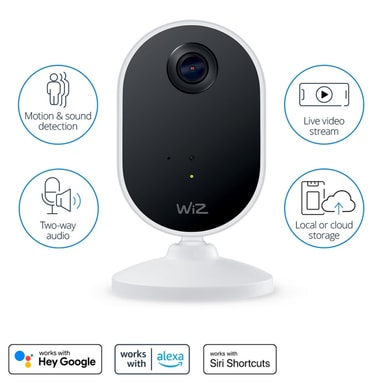 Kombinationen av inomhuskameran och färglamporna erbjuder en fullständig lösning för att både förhindra inbrott och upptäcka, övervaka och bli informerad av aktivitet i hemmet – oavsett om du befinner dig i närheten eller långt från hemmet. Kameran kan placeras var som helst och utlösas av både rörelse, ljud och WiZ-appen.