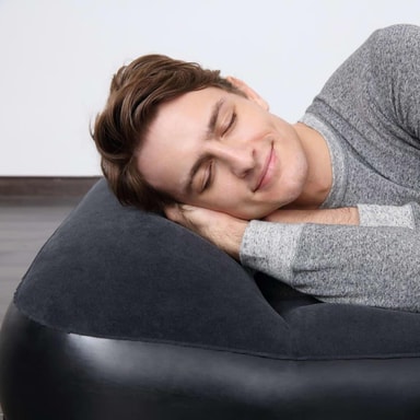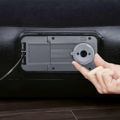 Den uppblåsbara dubbelmadrassen har en inbyggd el-pump som blåser upp madrassen på ca 2 minuter med en kraft på 220-240V. Dess hållbara I-balkskonstruktion gör den fast och stabil och den bekväma sovytan är otroligt skön att sova på.