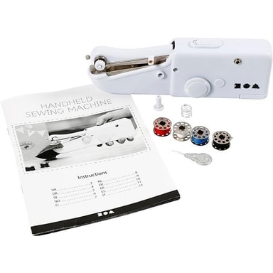 - Innehåller:1 handhållen symaskin, 1 nålpåträdare, 4 symaskinsspolar med tråd (svart, vit, blå, röd), 1 symaskinsnål, trådrullshållare