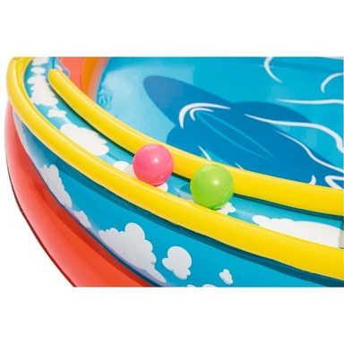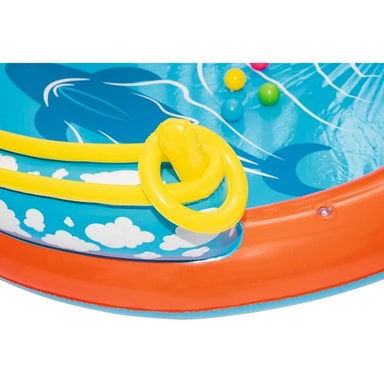 Tillverkad i slitstarkt material kan den här poolen rymma upp till 208 liter vatten och är lätt att sätta upp. Den har en avtagbar kana med rep, en lavatunnel med en basketring, en uppblåsbar ring för ringkastning och en bollramp. En sektion på poolgolvet kan också blåsas upp för att fungera som en kudde för kanan. Dessutom har den en vattenspridare som kan fästas på din trädgårdsslang och ger extra kul.