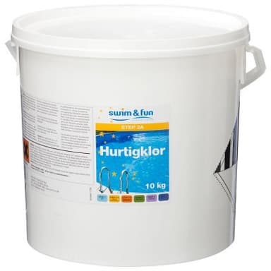 klor starter snabbklor granulatanvänds när poolen precis har blivit fylld med vatten, eller när det finns ett specifikt problem som beläggningar eller smutsigt och grumligt vatten. Vattnet tillförs en högre dos av desinfektionsmedel än normalt för effektiv desinficering. klor starter snabbklor granulat innehåller en stabilisator som förhindrar nedbrytning av solens uv-strålar.
