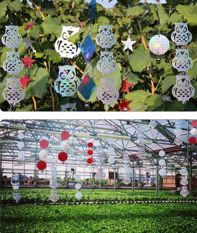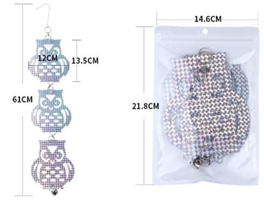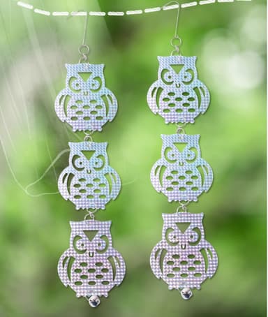 Sats med reflekterande ugglor som fungerar som fågelskrämma. Hängs upp för att sedan svaja i vinden och reflektera solljuset vilket skrämmer bort fåglar utan att skada dem. Fågelskrämmorna är samtidigt en fin dekoration på balkongen eller i trädgården.