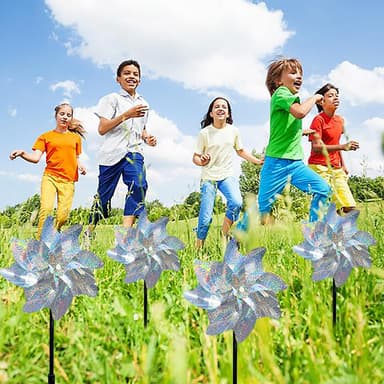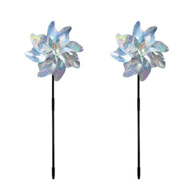 Set med reflekterande vindsnurror som även fungerar som fågelskrämmor. Sticks ner i jorden för att sedan snurra i vinden och reflektera solljuset vilket skrämmer bort fåglar utan att skada dem. Snurrorna är samtidigt en fin dekoration på balkongen eller i trädgården.