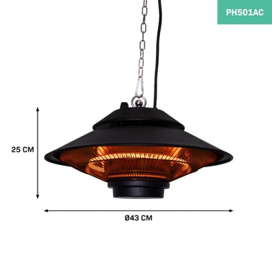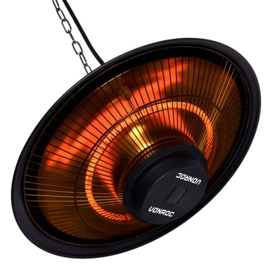 Uppskattar du att vara utomhus men det är lite för kyligt? Då är denna hängande terrassvärmare precis vad du behöver. Denna värmare kan du enkelt montera i taket eller under ett parasoll. Eftersom att du hänger upp värmaren så tar den inget extra utrymme och du kan alltid ha den till hans. Den kraftfulla 1500W infraröda lampan utstrålar värmen jämt 360 ° runt. Du kan alltså förlänga sommaren och njuta av en behaglig temperatur året runt med VONROC.